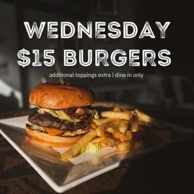Come out and try our new homemade burgers every Wednesday all day for only $15!!