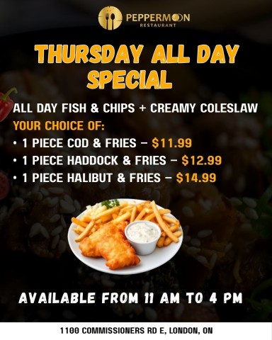 #PeppermoonRestaurant #LondonOntarioEats #FishAndChips #LunchSpecial #ThursdaySpecial #LondonOntarioFoodies #SeafoodLovers #YumLondon #OntarioEats #LondonFoodScene #FoodieFinds #FreshAndCrispy