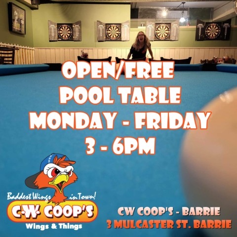 Tag your pool buddies and let’s play! 🎱🔥 #FreePool #HappyHour #CWCoopsBarrie