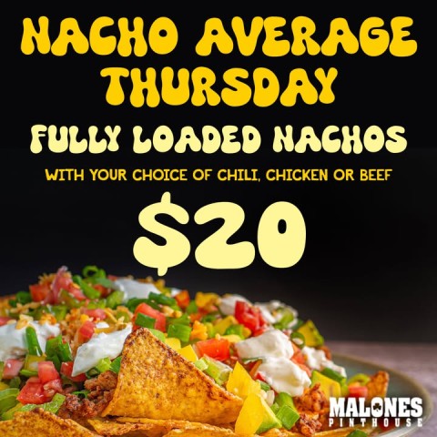 It's #NachoAverageThursday - get a full order of fully loaded nachos - chili, chicken, or TexMex beef - for just $20!